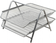 В наборе два лотка. Прочная и устойчивая металлическая конструкция. Лотки могут использоваться отдельно от рамы. Изготовлены из перфорированного металла (металлическая сетка). Для хранения и сортировки документов. Указан размеры: длина × ширина × высота.