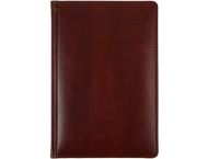 Формат ≈А5. Обложка из искусственной кожи с поролоновой подкладкой, швейная строчка по периметру. Золотистый срез блока. Внутренний блок — тонированная бумага, двухцветная печать, линия, 2 закладки-ляссе. Прошит. Содержит блок полезной информации, календарь на 2026-29 годы, страницы для записи телефонных номеров, отрывные листы для заметок. Перфорированные уголки. В деталях указан размер, количество листов, цвет обложки.