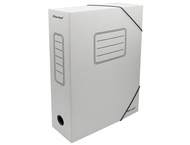 Формат А4. Изготовлены из микрогофрокартона. Три широких и объемных клапана закрываются при помощи резинок. Имеются удобные отверстия для захвата на корешке и дне при изъятии с полки. Линованный идентификатор на лицевой стороне и корешке для подписи. Указаны размеры: ширина×высота×толщина корешка.