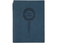 Формат ≈А5. Обложка изготовлена из искусственной кожи. Внутренний блок — тонированная бумага, одноцветная печать, линия. Прошит. Ручка шариковая автоматическая, пластиковый корпус, нажимной механизм подачи стержня, стержень синий. В деталях указан размер, количество листов, цвет обложки.