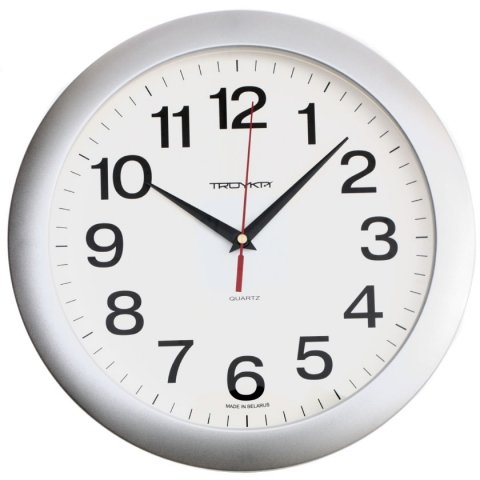 Кварцевые часы в пластиковом корпусе. Имеют плавный ход секундной стрелки. Работают от элемента питания: АА - 1 шт. (приобретается отдельно). Циферблат арабский. Круглые, диаметр — 290 мм. Классический дизайн, цвет фона белый. Указан цвет рамки.