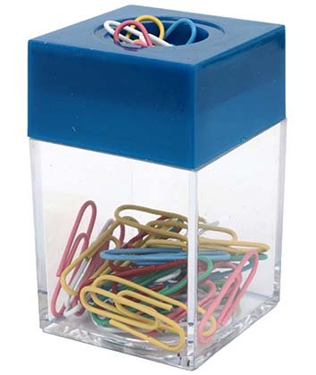 Пластиковый диспенсер для скрепок с магнитом, благодаря чему скрепки удерживаются на стенках диспенсера. В комплекте с диспенсером скрепки, 30 шт., с цветным виниловым покрытием (длина 28 мм). В деталях указаны размеры: ширина×высота×глубина.