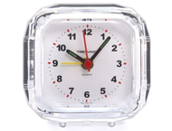 Часы настольные с будильником. Пластиковый корпус. Минеральное стекло. Белый фон. Циферблат арабский. Работают от батареек типа АА. Размеры — 75×70×35 мм. В деталях указан цвет.