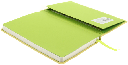 Формат ≈ А5. Обложка из твердого картона с покрытием из искусственной кожи. Цветные форзацы. Внутренний блок — бумага тонированная («слоновая кость»), цвет графления — серый. Вертикальная фиксирующая резинка, ляссе, углы закруглены. Содержит 3 листа с наклейками, дополнительный карман. В деталях указан размер, количество листов, тип графления, цвет обложки.